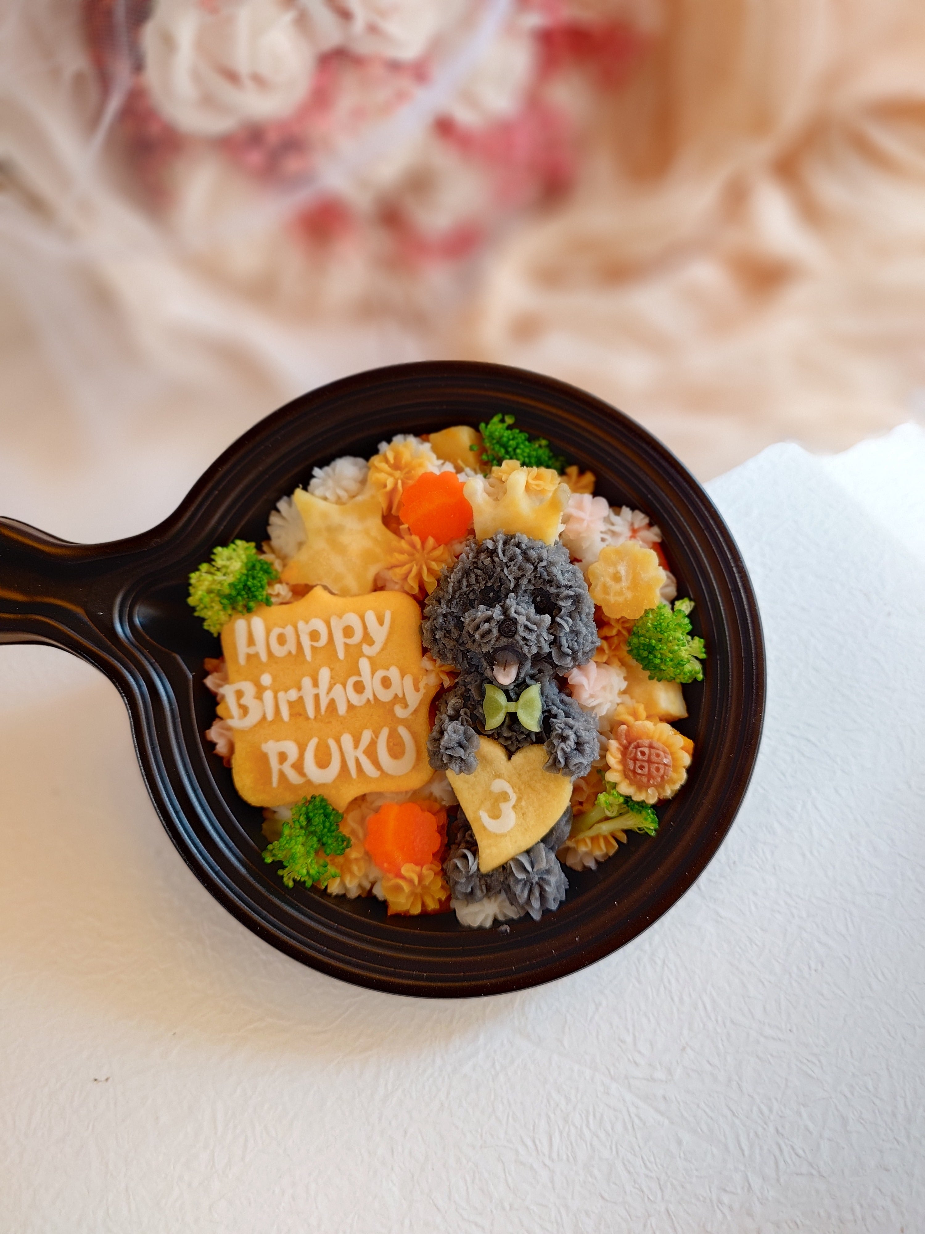 わんちゃんが大好きなお芋・にんじん・かぼちゃ・ブロッコリー・鶏胸肉に、ヤギミルクとオートミールパウダーを合わせた低カロリーのお食事タイプのBirthdayプレートです。